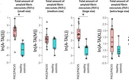יתר על כן, בדיקה זו לא רק מעריכה את הכמות הכוללת של חלקיקי ThT+ ו-ThT-, אלא גם זיהתה שגודל משחק תפקיד מכריע ב קרישוני דם . באמצעות ציטומטריית זרימת הדמיה מתקדמת, הבדיקה מנתחת מספר גבוה של קרישוני דם עם דיוק גבוה, המאפשר הערכה מפורטת ואמינה. למשל, קטן קרישוני דם הם מווסתים לעתים קרובות בחולי Post-Vac, ואילו בגודל בינוני קרישוני דם לא מציגים את אותה תבנית.